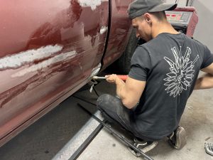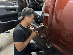 Solidnie przygotowaliśmy drzwi i słupek: zdarliśmy lakier, oczyściliśmy powierzchnię i przygotowaliśmy wszystko pod dalsze prace. Dzięki użyciu spotera, udało się skutecznie wyciągnąć wgniecenia i przywrócić elementom pierwotny kształt.